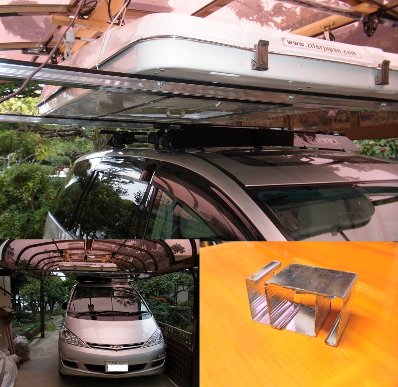 エスティマにルーフテントを乗せては走っていると60kgの重さが影響して、燃費が悪くなる。高速道路では、100km/hで悠々と走るが、10km/lを割って9.0km/lまで落ちる。平均80km/hで10km/lが維持できる。使用しない場合は外して保管することに。 カーポートにLiftを付けているが、細い紐では心もとないため、支えのバーを作成する。手持ちのパイプを利用したが、時間とともにたるんでくる。もう少し強いものをということで、事務所の壁の柱に使うコノ字型の軽鉄材を利用して作成した。・・・