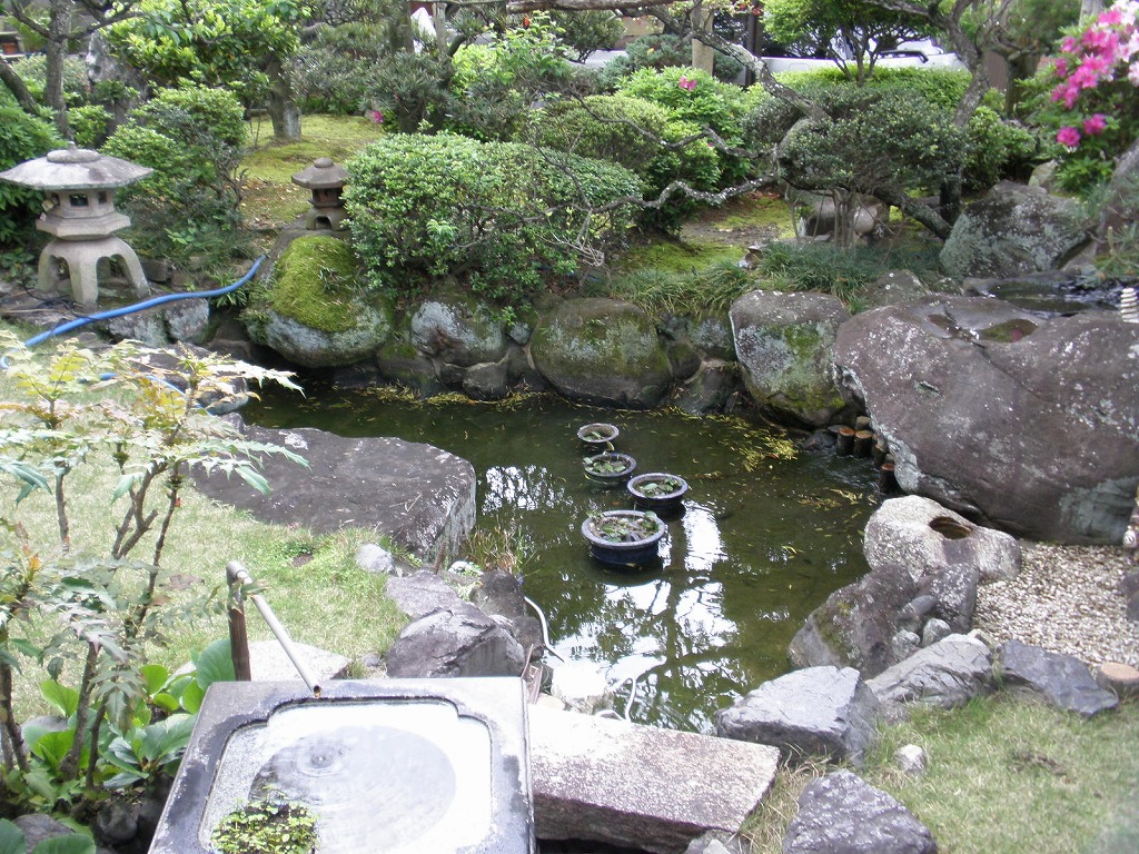 池への給水に、手水鉢に水を満たし、流れ落ちた下側で、受け止め、この水を池に流している。