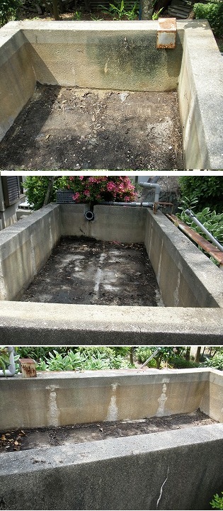 古いモルタルの上に、新しいモルタルを重ねるが、その接着がうまくいくように接着台を塗布する。池の淵は、捌け塗で、底麺は、ローラで一気に塗りこむ。古いモルタルは、手で触ると、須永粉上に、あるいはセメントが粉を吹いた状態であるが、この接着剤を塗布すると、表面がしっかりと固まった状態になる。 50%希釈で下塗りし、30%希釈程度で上塗りを刷る。