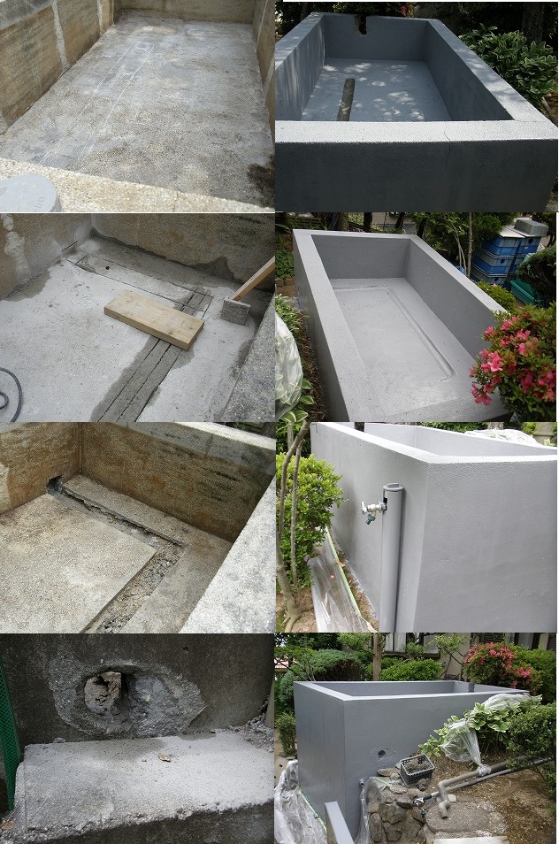 浄化槽の掃除をしやすくするため、ポリ箱の底に、ふろの栓を取り付け、千wwっを取ると水替えできるように改造する。 その排水の水を流すための排水管設置のために排水溝の工事を行う。コンクリート用のディスクサンダーの刃(歯)を入手し、一気に溝を作る。コンクリートが古いのか、薄いのか意外に簡単に作業は進む。コンクリートを斫り、必要な溝は数時間で完成した。 コンクリートを流し込み、排水管設置できるように樋の形に収める。(6月2日)