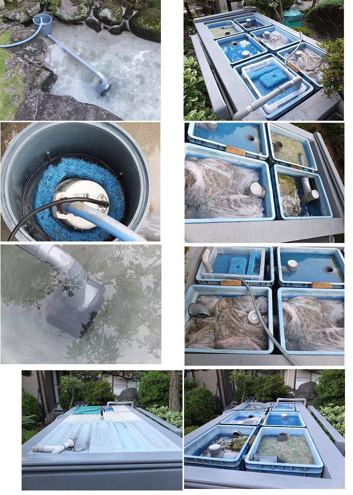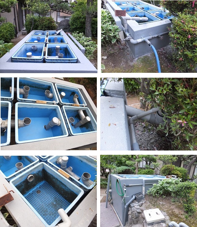 池の排水ポンプ周りは、池の最深部より取り出して、浄化槽へ。 浄化槽は、六つの機能を持たせて分離している。 各機能は、前述を参考に