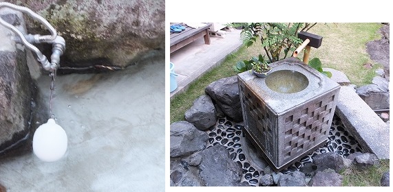 池の水面の高さにより給水・止水を行うトイレの水栓を池のふちに設置。水は手水鉢より流れ出る
