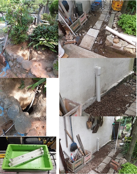 写真は、ガレージからの引き出しと 庭の石垣の内側を通して、浄化槽へ