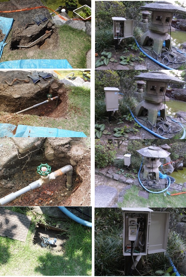 池に新たなポンプの設置と浄化槽に殺菌灯・空気のポンプを設置したため、新たなコンセントが必要となり、ガレージより電気を引き回す。