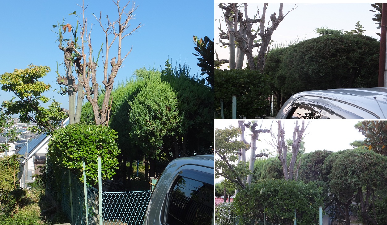 此処の貝塚息吹は、ちょうど裏の崖の真上にあり、脚立がすんなり立たない場所にある。以前入ってもらった植木屋さんも、木の表面をバリカンで整形するのみで、下から見上げると、頂点に近い内側には古い葉っぱの枯葉がこびりついており、雨宿りが十分できる状態になっている。