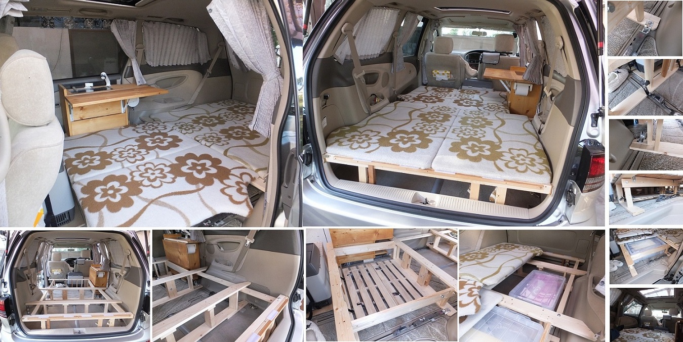 一昨年、エスティマを数か月かけて改造したが、荷物の置き場に困り、また風雨が強い場合に、屋根の上のテントでは、心配なこともあり、室内で就寝ができるように、二次改造を行った。