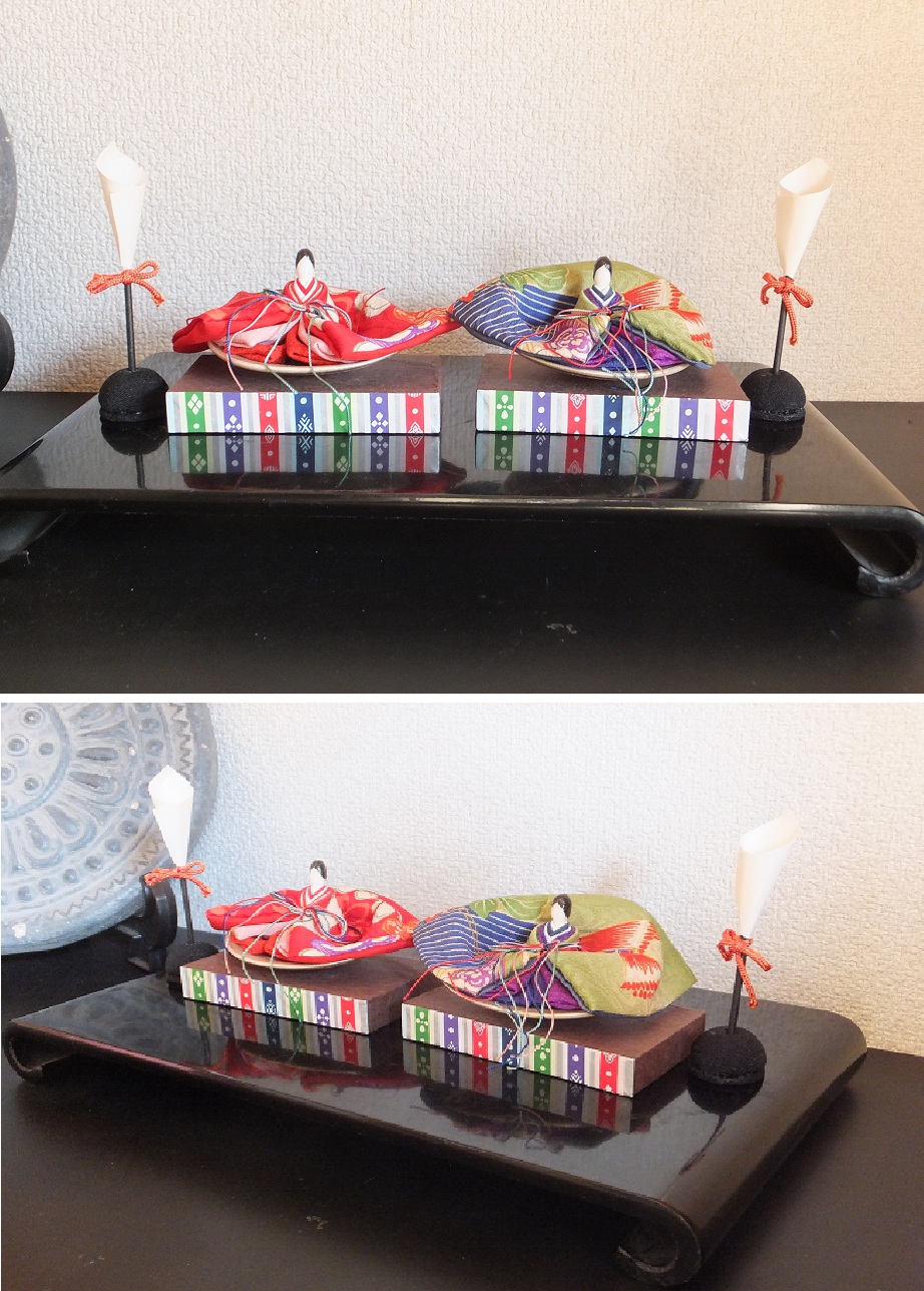 また、この時期がやってきました。玄関の横の棚に飾られたお雛様。
