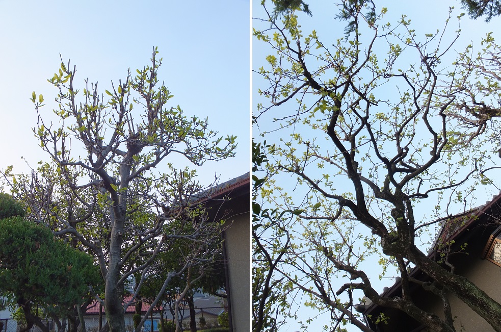 柿の木は、剪定がわからずと毎年何もしたいで過ごしていたが、白モクレンの後ろで、若葉がしっかりと出ている。その中に何もない染んだ枝が散見される。剪定というより枝払いであるが、この枝を取っただけでも、すっきりとなった。