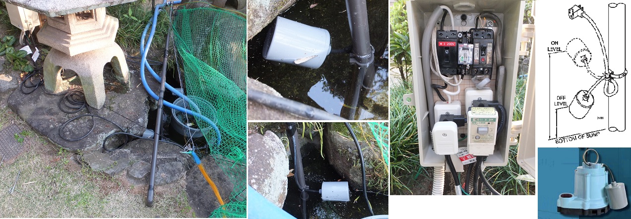 一昨年、池の水が、浄化槽からあふれ出て、水がなくなるまでポンプが動いて、その結果、池の水たまりだけたまった状態で、十数年世話をしていた鯉がなくなった事があったが、今回太陽光発電で、新たにポンプを入れたことから、ある程度水面が下がれば、自動的に停止するこのスイッチの導入を考えた。