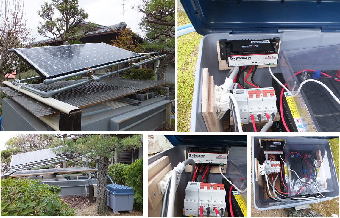池で四六時中唸っている水中ポンプを日中だけは太陽光でという構想が2年ほど前からくすぶっていた。 今回、太陽光発電をするにあたって、パネルの一枚余分に入手し、この構想を実現すべく具体的に動いた。