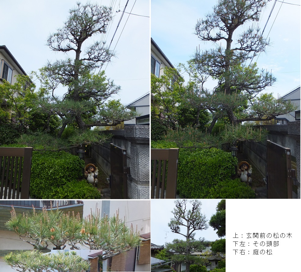 また剪定が始まった。松の木のにょきっと出た新芽。三本ある中の真ん中を切り取り左右の二本を適当な長さでつまみ落とす。
