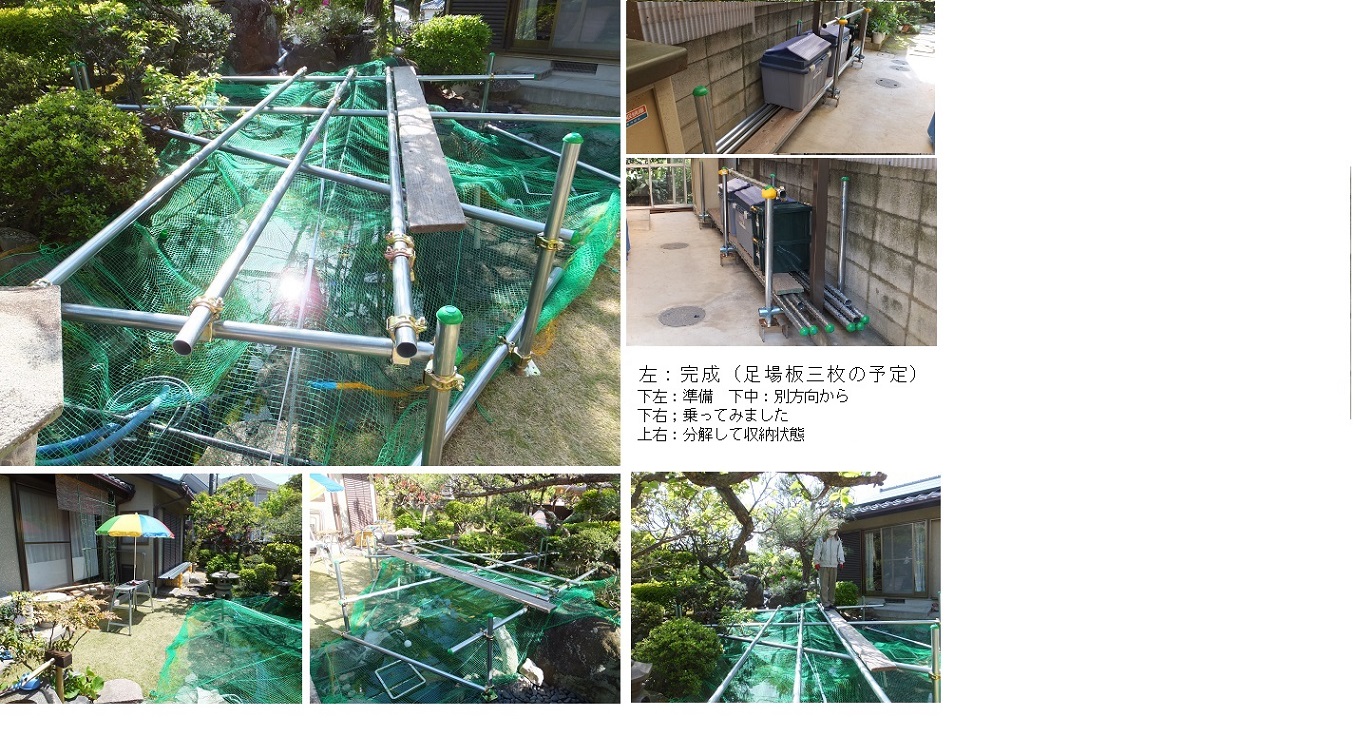 池の上に長く伸びた枝を持つ松の木。剪定の時はいつもどうしようかと悩みの種であった。 12尺と10尺の三脚二本、1,5メートルの梯子二本を橋渡しとしてその上に足場用の板を載せ、ゆらゆらしながらの剪定作業。 どうにか無事できたが、いよいよ足場の作成の時が・・・