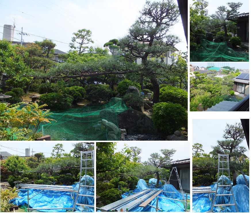 暇な毎日であるが、何かしら用事が入り、遅れ遅れになっていた松の剪定。連休中に池の上に足場を組む準備をしていたが、やっと本番の日を迎えた。