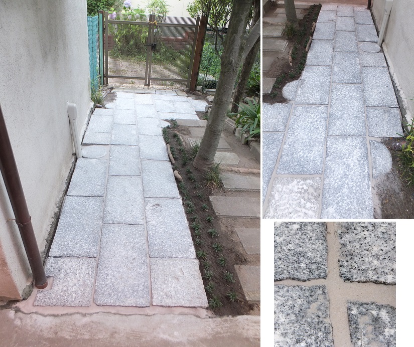 梅雨の晴れ間を塗って敷石の間に「珪砂」を入れて、ほぼ完成しました。細かい白い砂。袋からスコップで敷石の間に入れていく。最後に水をまいて敷石をきれいに流すと写真のように目地に入り込み、乾燥すると固まったようにぴっちりと納まる。