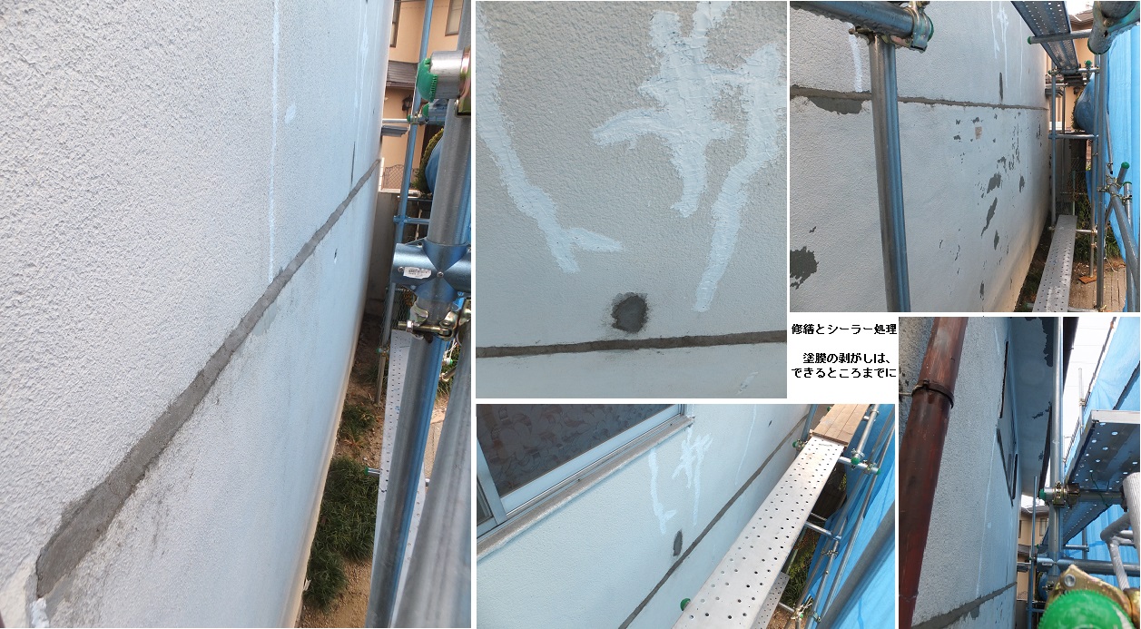 西面の旧塗膜の剥がしと修繕・コーキングが完了。