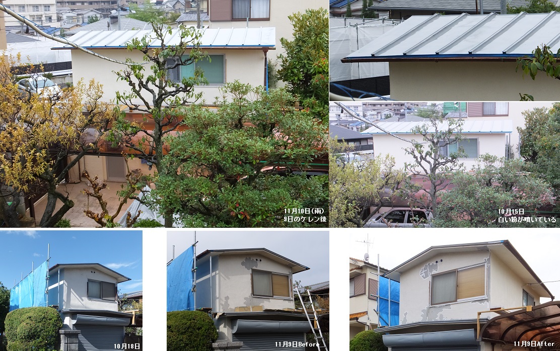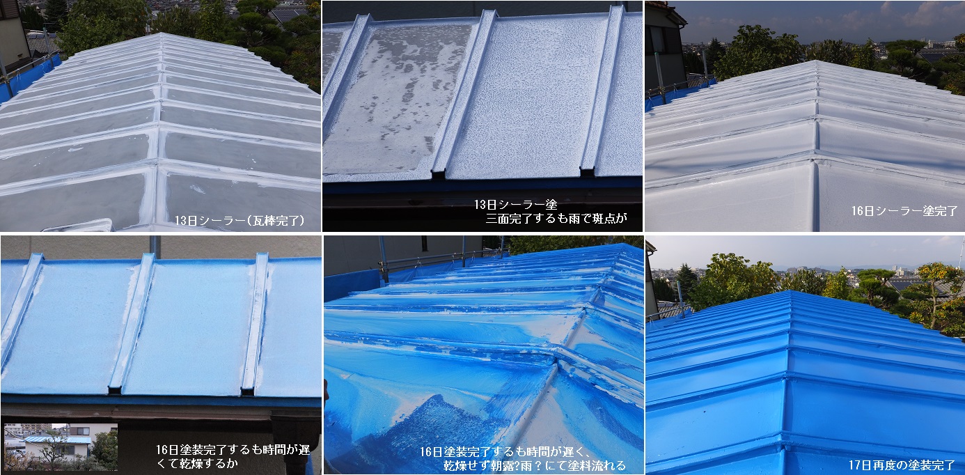 9日、屋根のケレン(塗装前の下準備)が終わる。 10日は雨で一休み。 11日は、雨上がりで、外壁の高圧洗浄を行う。 12日終日雨。 13日やっと屋根のシーラー塗りを行う。