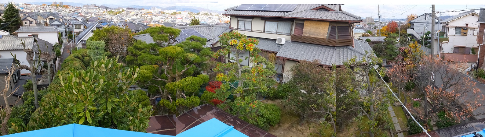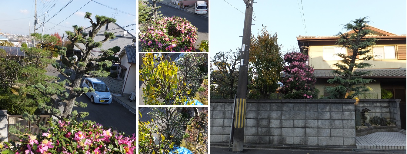 ちょうど剪定が終わった(松はまだ)庭木が眺められたので、写真を撮っておく。三枚に開かれているが、一枚に合わせてお見せしよう