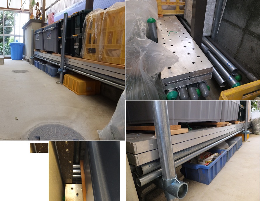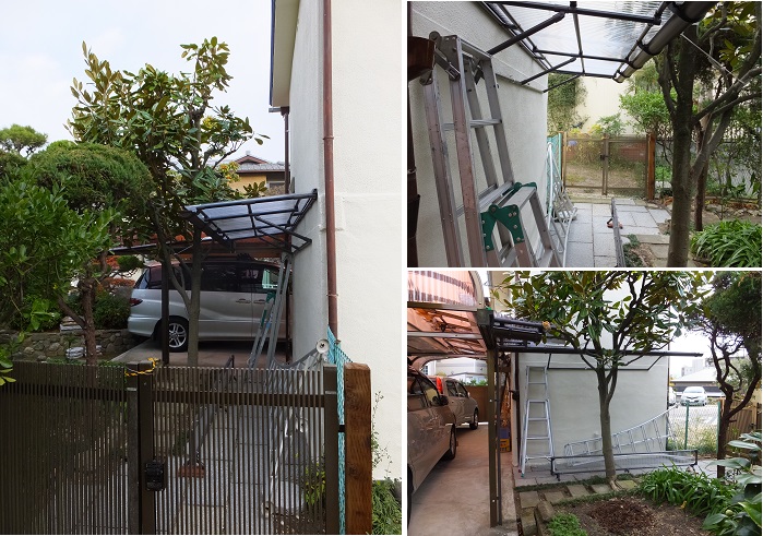 今年の選定作業が終わり、足場の利用がなくなったので、片づけた。勝手口の屋根の下に、丸管でH型に組んだ置台の上に並べ、その上に足場板を載せて平らにし、灯油缶の入ったBOXをその上に載せて、見栄えよく、整理整頓した。