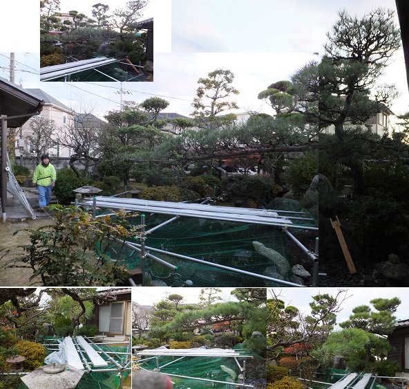 池の上の松の木。外壁工事が終わった足場を剪定のために池の上に組み立てる。今回は、外壁工事で培った技術?を駆使して一時間弱で終了。