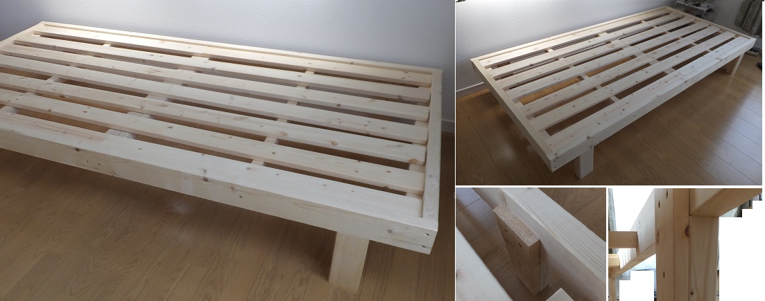 以前、赤ちゃん用のベットを製作したことを思い出し、安価な2X4のSPF材を使って製作することにした。 定尺の(これが一番安い)2X4の6Fサイズが38x76x180cm。長さが足りない。また上に乗せるすのこも足りない。いろいろ試算するが、少々高いが、長さが12F(3640cm)を基本にして設計を始める。