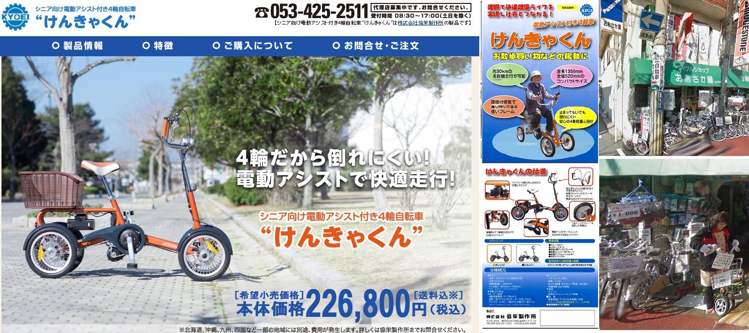 90歳の叔父が月一回の病院通いをするために自転車に乗っている。車の少ない路地とはいえ少々心配していたところ、「四輪自転車で電動式」の情報を入手した。早速ホームページで確認したところ浜松のYAMAHAのバイク部品製造をしている協栄製作所で製造していることがわかり、問い合わせをしたのが一年前。