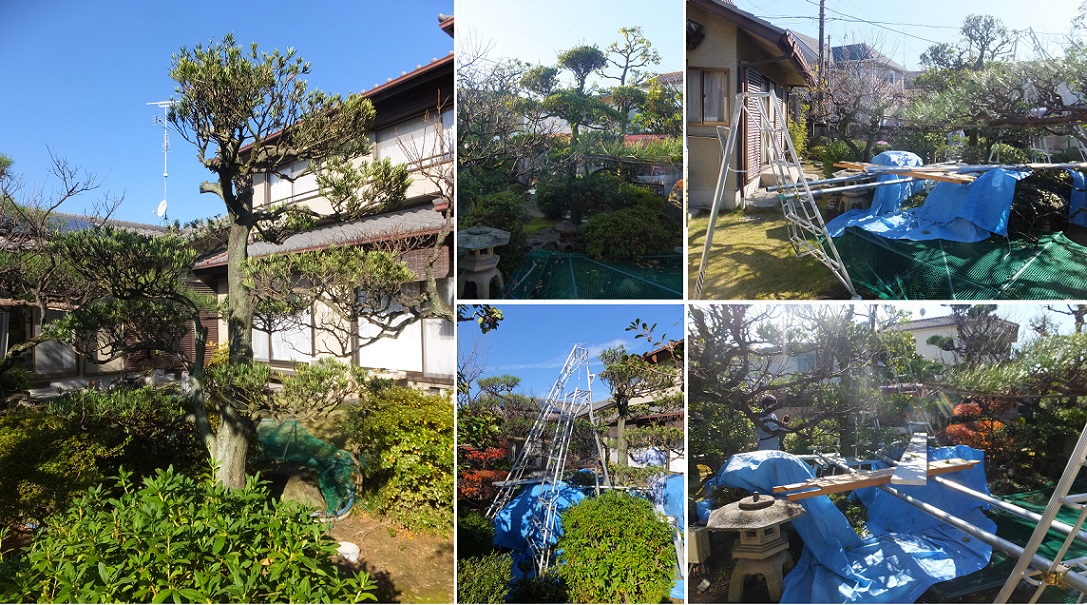 雨日の間の青空のもと、例年より約半月早く、今年予定の剪定が終了しました。 松の木に時間がかかり、最後になったラカンマキ。昨年度はしっかりと手入れをしないまま終了したが、今年は、松の木に使用したかたずいていない足場を使用して、臨時の足場を組んでみた。