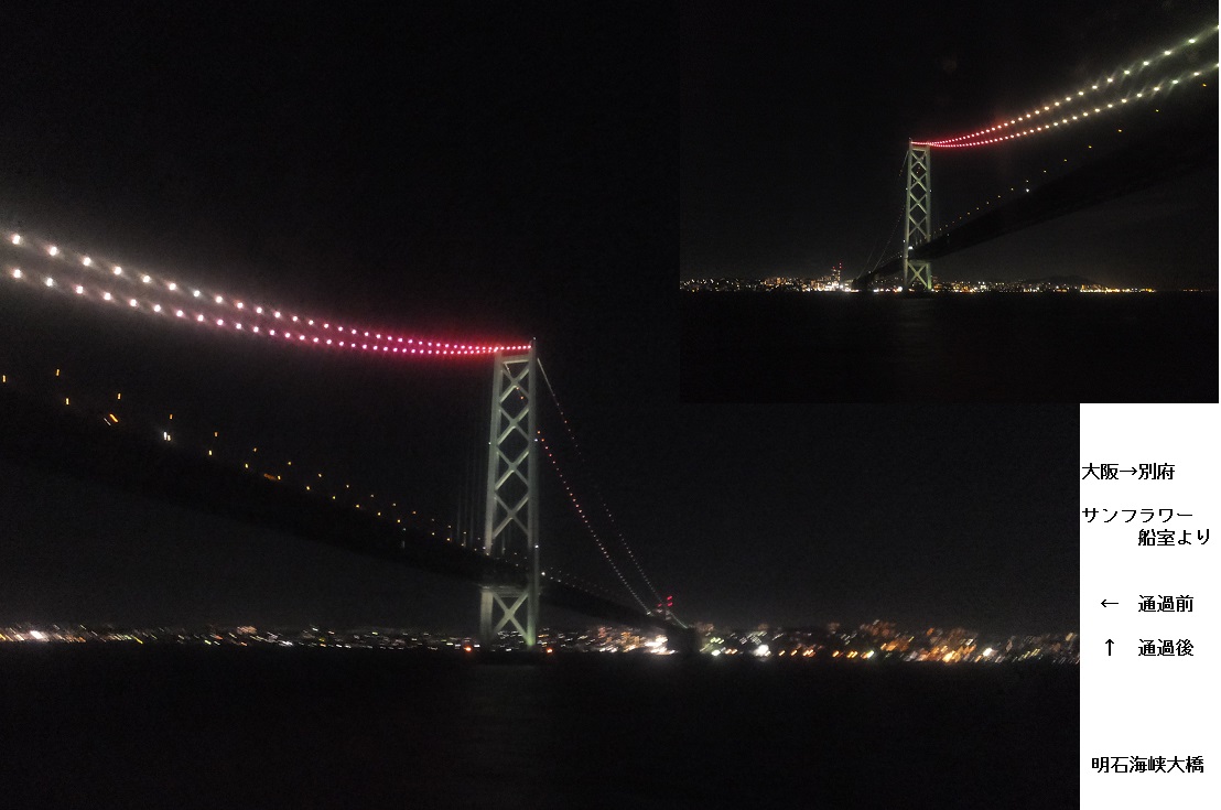 真夜中に目を覚ます。ちょうど「瀬戸内しまなみ海道」の橋が目前。 船窓から眺める。イルミネーションがきれい。写真を撮るがどれもピンボケ。 再びベッドに。