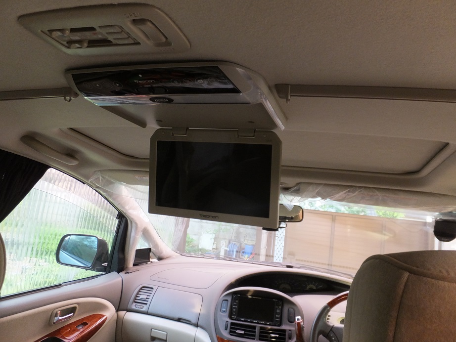 以前5Inchのモニターをヘッドレストに着けていたが、画面の大きさが小さいため、活用できずにいたが、出入りの度に身体がふれアームが破損したこともあった。この際天井に付けてしまえと新しいモニターを購入。DIYで設置した。