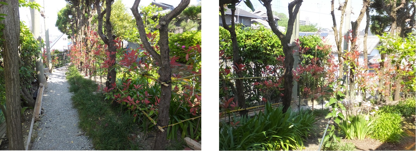先日、カナメの垣を作ったが、植えてから一度も剪定を行っていないので、枝がバラバラである。