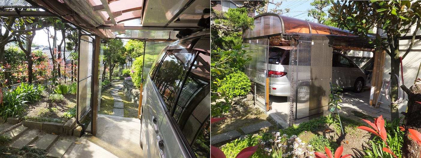 以前から余っていた波板の活用を考えていたが、カーポートの吹き降りを減らすために雨除けを作成。