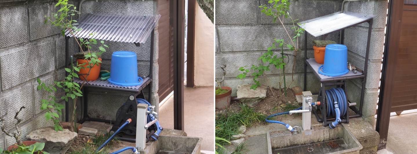 以前からため込んでいた波板と、予備に持っていたパイプを活用して、水栓周りの物置を作成した。