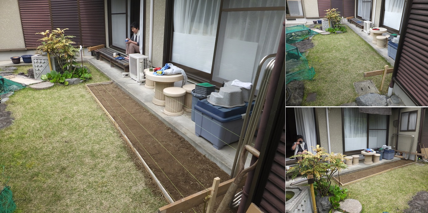 出来上がった後のメンテができないため、手入れが不要状態にする。 娘と叔父の所は、防草シートを張った上に砂利を敷いたが、今回は防草土(真砂土塗装)をしようかと思う。