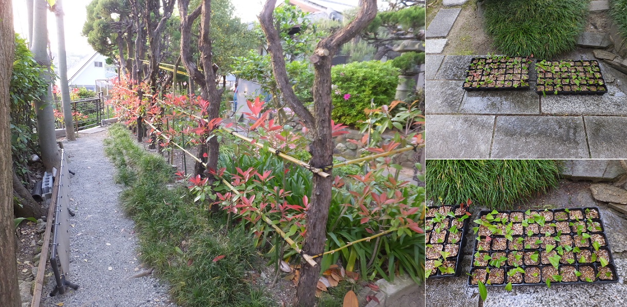 カナメの繁殖力を活用して、剪定した枝を挿し木にしてみる。