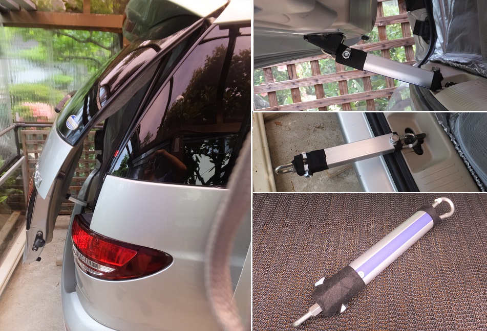 後ろのドアに網を付けたことで、駐車時に扉を少し開けて、隙間風を呼び込むことができるように、扉を開けた状態でロックできる金具の検討をしていた。