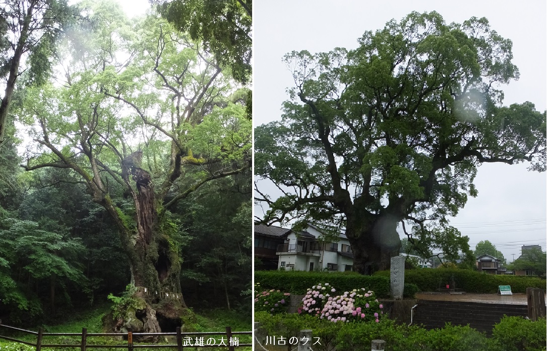 佐賀県の各地に楠がさかえていたことは「肥前国風土記」によっても 知られていますが、その最大のものが川古のクスです。 全国巨樹・巨森調査では、福岡県築城町本庄の大楠とともに 五番目の大きさを誇る巨木です。 樹幹には僧行基が刻んだと伝えられる幹彫の観音像がありましたが、 剥落したため、隣接する観音堂に安置されています。 大正13年3月9日 国指定 平成16年6月設置 武雄教育委員会