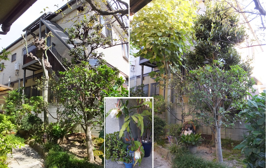 明日からの雨を見込んで、休みを返上して勝手口横にある「桐の木:我が家のあちらこちらに植わっている三本の一つ)と「月桂樹」を剪定。