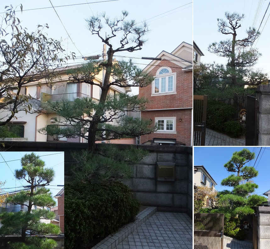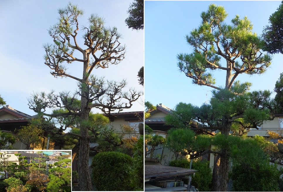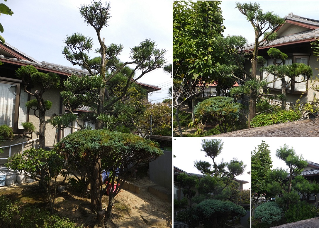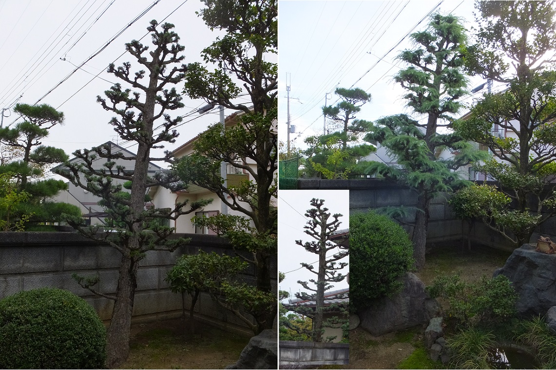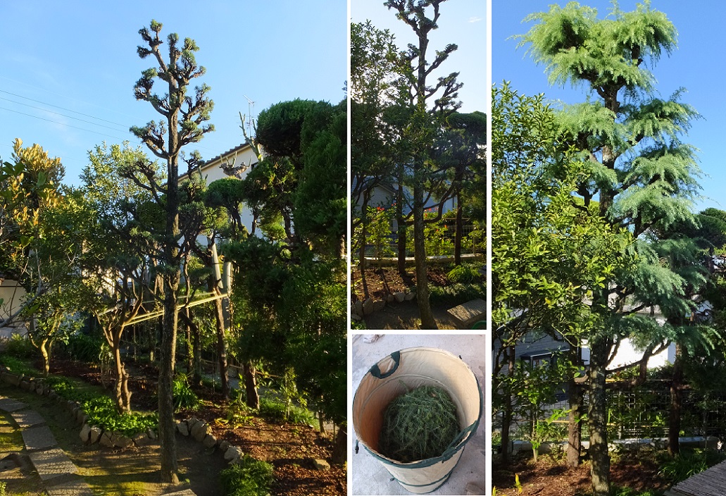 残る三本の松。最初は玄関横。12尺の三脚でも手が届かないため、今年はとうとう一番上の約50Cmの枝を切ってしましました。