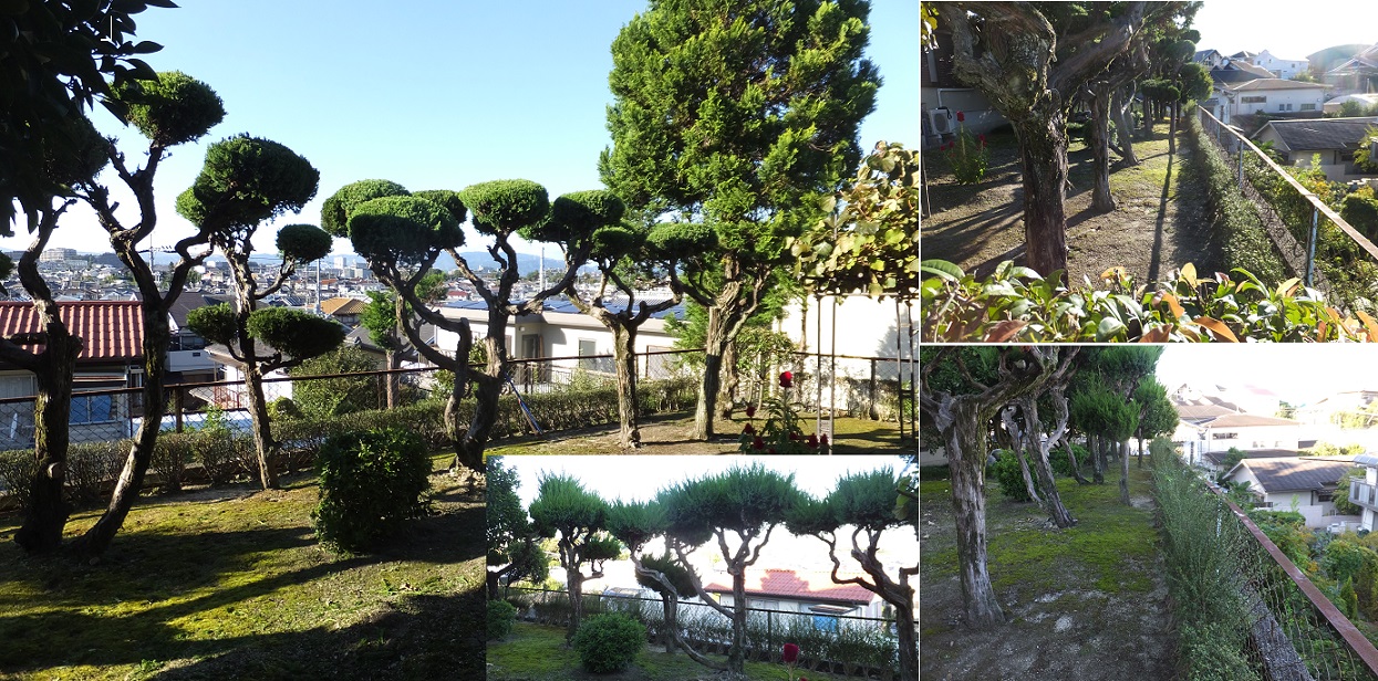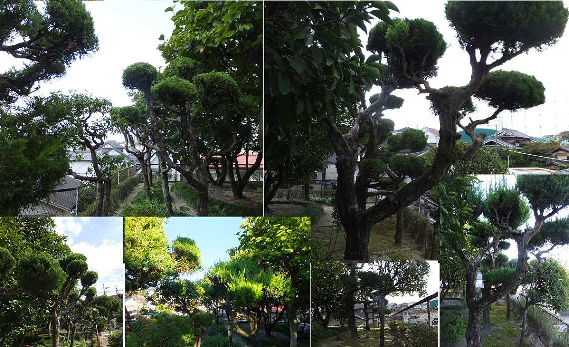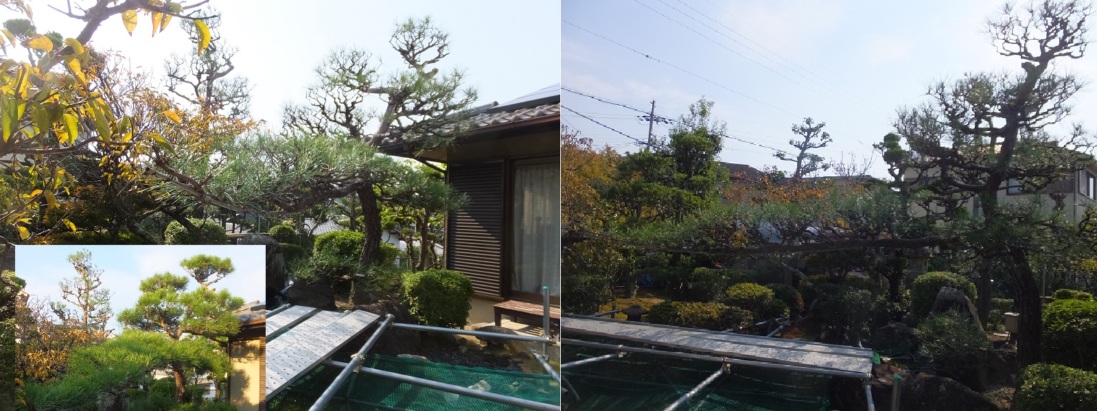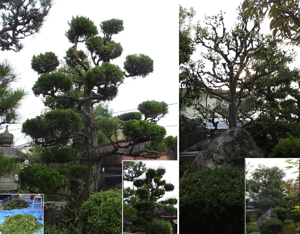 残る三本の松。最初は玄関横。12尺の三脚でも手が届かないため、今年はとうとう一番上の約50Cmの枝を切ってしましました。