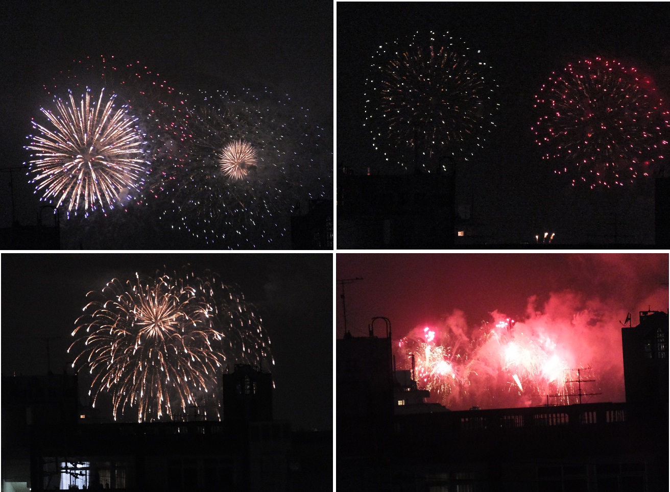 ここは宜野湾の山手。海のほうを見るとビルの間から花火が立ち上がっている。