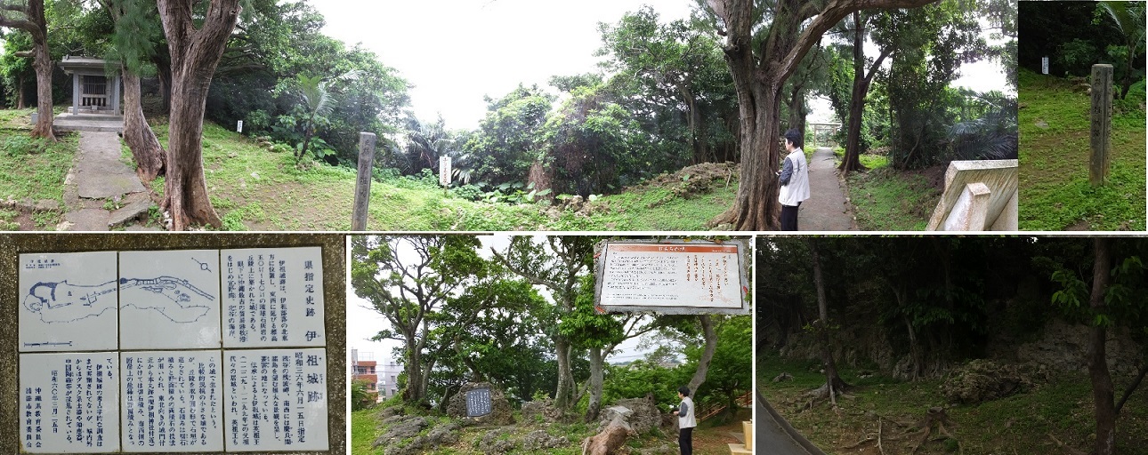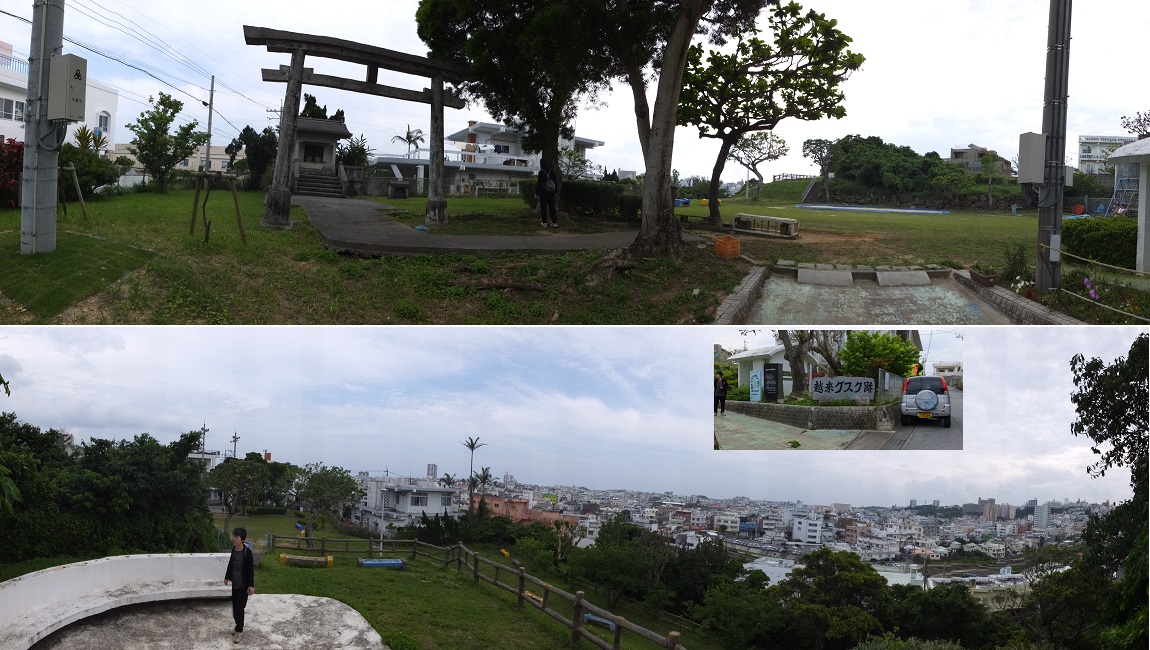 浦添城址の海側にある伊祖城跡。現在は伊祖公園の中に取り込まれている。 曇天で訪れたため、宜野湾の海岸を見ることができなかったが、丘の最上部にある伊祖神社の木々の間から遠く残波岬、慶良間諸島、北谷、牧港が見渡せるようである。