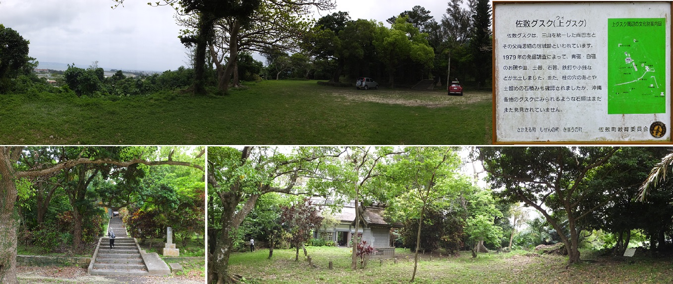 佐敷グスクは、三山を統一した尚巴志とその父尚思紹の居城跡といわれています。1979年の発掘調査によって、 青磁・白磁のお椀や皿、土器、石器、鉄釘や小銭などが出土しました。また、柱の穴のあとや土留めの石積みも確認されましたが、沖縄各地のグスクにみられるような石垣はまだまだ、発見されていません。 さかえる町しぜんの町きぼうの町 佐敷町教育委員会