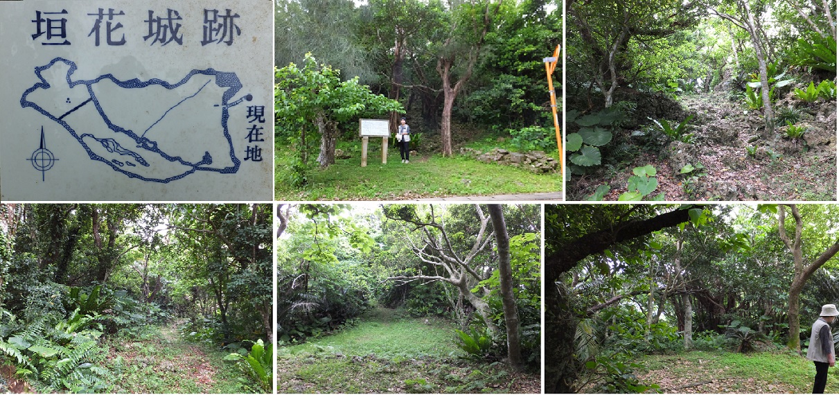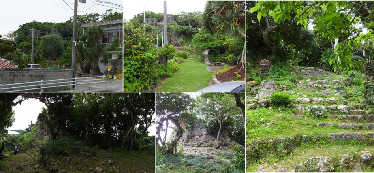329線を北上し、コザの十字路を抜けさらに沖縄北ICの先、池原で右に折れ、県道224号と交差、その先に小高い丘がみえる。目指す「兼箇段城跡」。一本入った細道に拝所のある広場が隣接している。 無断で駐車させてもらい、その奥に行くと古びた拝所がある。その横を抜けると、看板がみえる。地元の人たちが建てた標識のようだ。