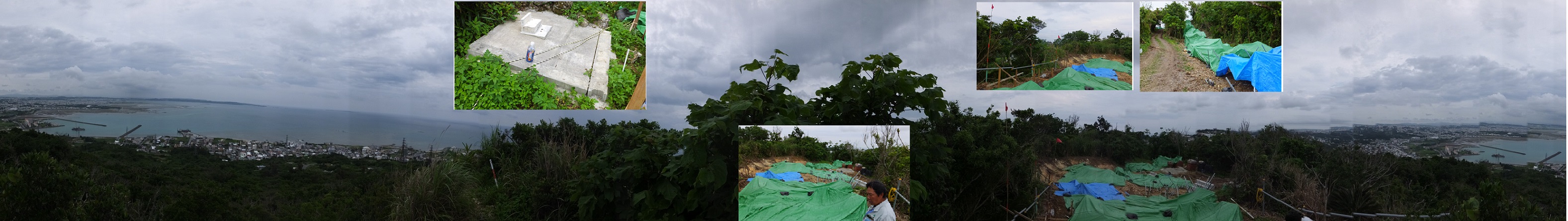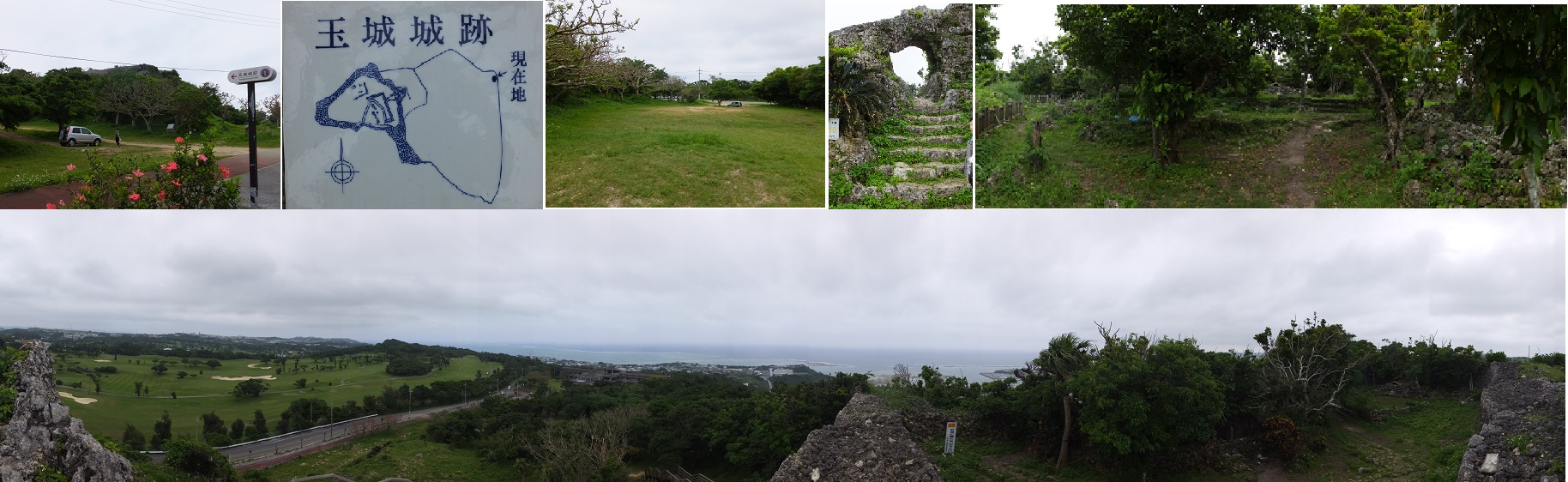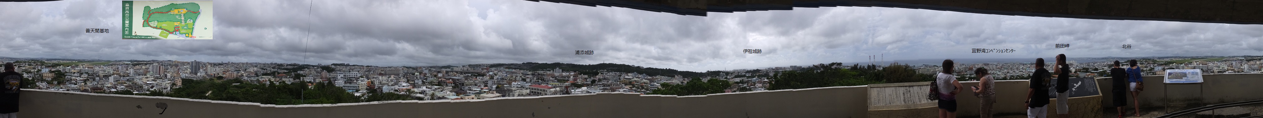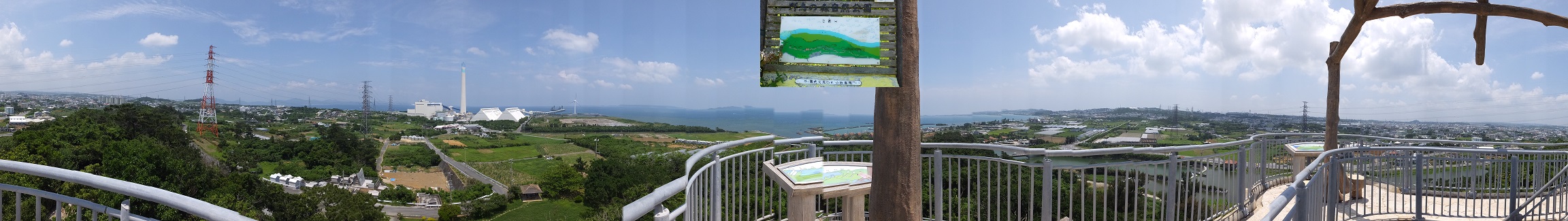 かなり高い所に展望台があり、ここから見ると、360度見渡すことが出来る。 海には、海中道路の橋から始まり、浜比嘉島、平安座島、宮城島、伊計島が連なっている。 北には、天願城跡が、南には、具志川城址がその向こうには勝連城址がみえる。
