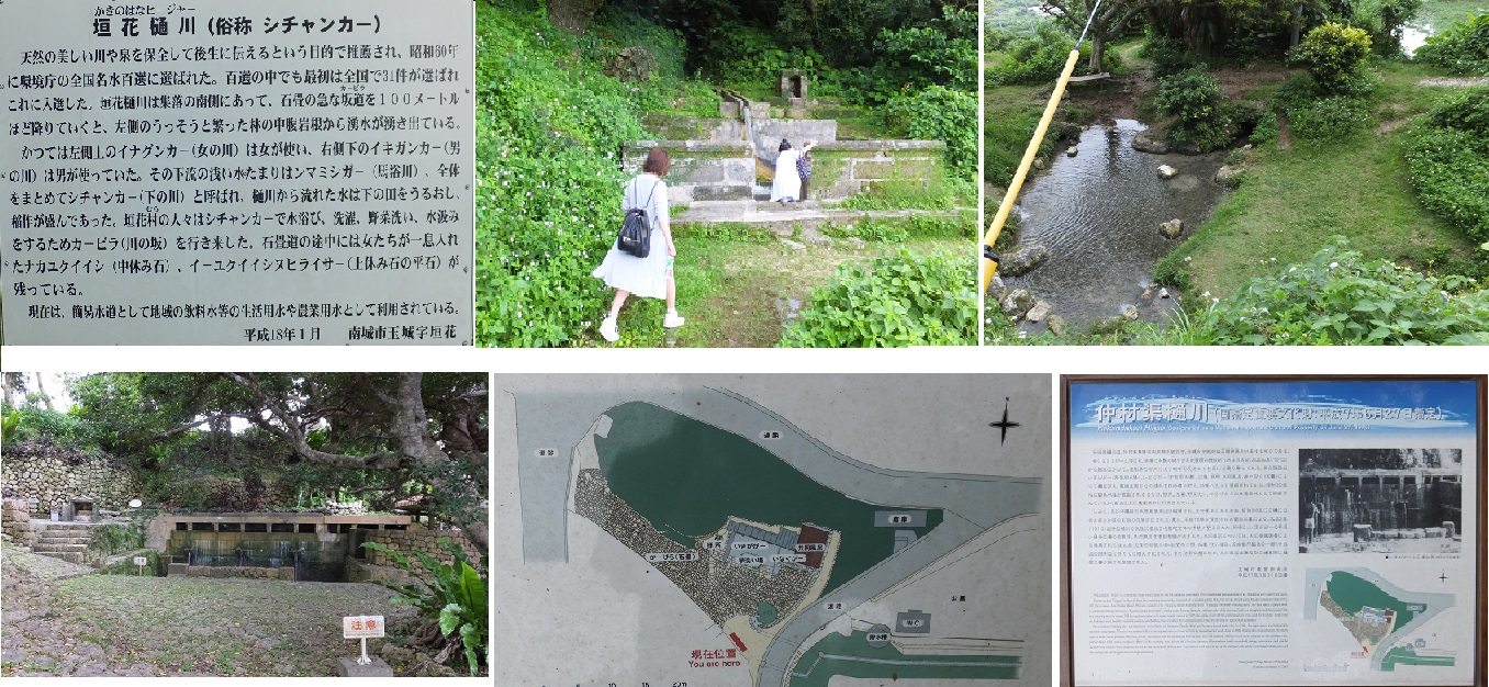 垣花樋川(かきのはなヒージャー)(俗称 シチャンカー) 天然の美しい川や泉を保全して後世に伝えるという目的で推薦され、昭和60年に環境庁の全国名水百選に選ばれた。百選の中でも最初は全国で31件が選ばれこれに入仲村渠樋川選した。垣花樋川は集落の南側にあって、石畳の急な坂道を100メートルほど降りていくと、左側にうっそうと繁った林の中腹岩根から湧水が湧き出ている。 かっては左側上のイナグンガー(女の川)は女が使い、右側下のイキガンガー(男の川)は男が使っていた。その下流の浅い水たまりはンマミシガー(馬浴川)、全体をまとめてシチャンカー(下の川)と呼ばれ、樋川から流れた水は下の田をうるおし、稲作がさかんであった。垣花村の人々はシチャンカーで水浴び、洗濯、野菜洗い、水汲みをするためカービラ(川の坂)を行き来した。石畳道の途中には女たちが一息いれたナカユクイイシ(中休み石)、イーユクイイシヌヒライサー(上休み石の平石)が残っている。 現在は、簡易水道として地域の飲料水等の生活用水や農業用水として利用されている。 平成18年1月 南城市玉城字垣花