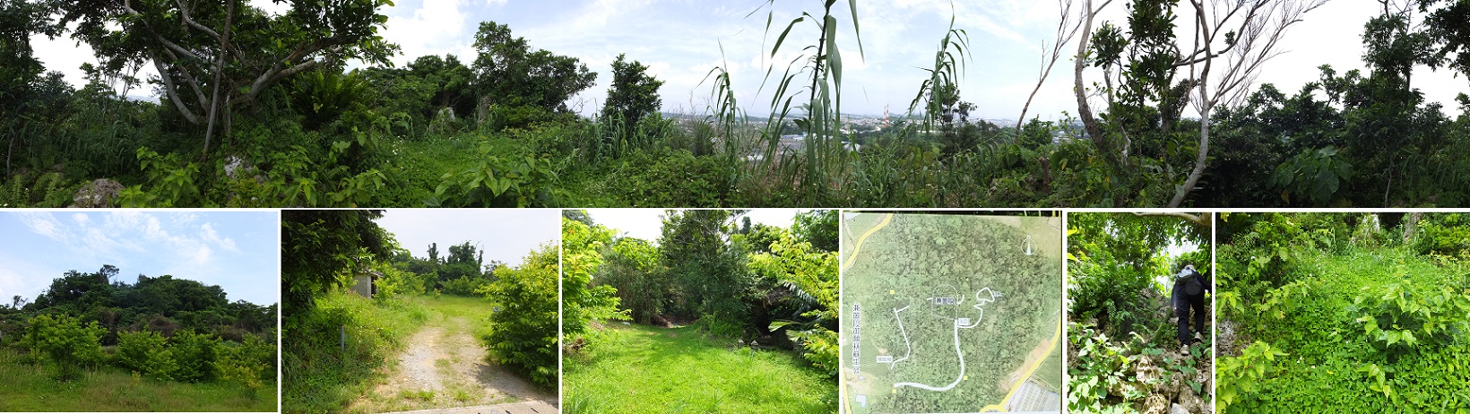 コザ十字路から西に一つ目の交差点を北に、越来城水辺公園の横道を入る。ホテル街?を抜け登り道を上がった左手に大きな標識がある。丘の北側は住宅街になっており、南側の街並みの見晴らしの良い広場になっている。