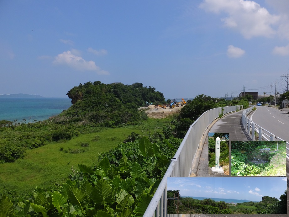 兼箇段城跡の横の224号を海に向かって進む。天願の交差点を更に進むと左側に米軍基地キャンプコートニーがみえる。小橋(下は県道に分けられたキャンプ地を結ぶ道)の脇を左折し、鉄条網に沿った道に入る。どんどん進むと農地が広がってくる。そこでが基地の中の小高い丘を探す。 海側の小高い丘がみえる。その手前には、米軍の施設がある。地図で確認するとTengaCafeと表記されている。 見晴らしのいい場所にある。