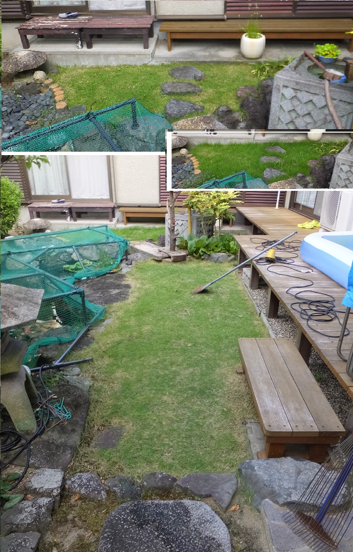母屋が影になる朝、昨年は一度しかしなかった芝刈りを行う。36度超す毎日であるが、伸び放題の髪の毛のようになった芝生。