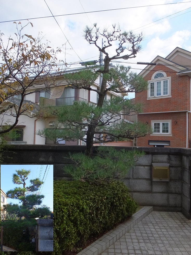 玄関前の松。今年の最後の剪定の松に、手が入った。途中で来核や、打合せがあり、完了せず、頭ンの実出来上がった。