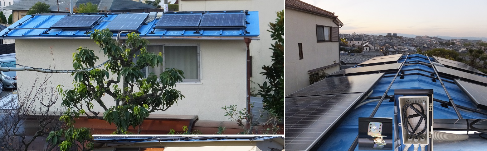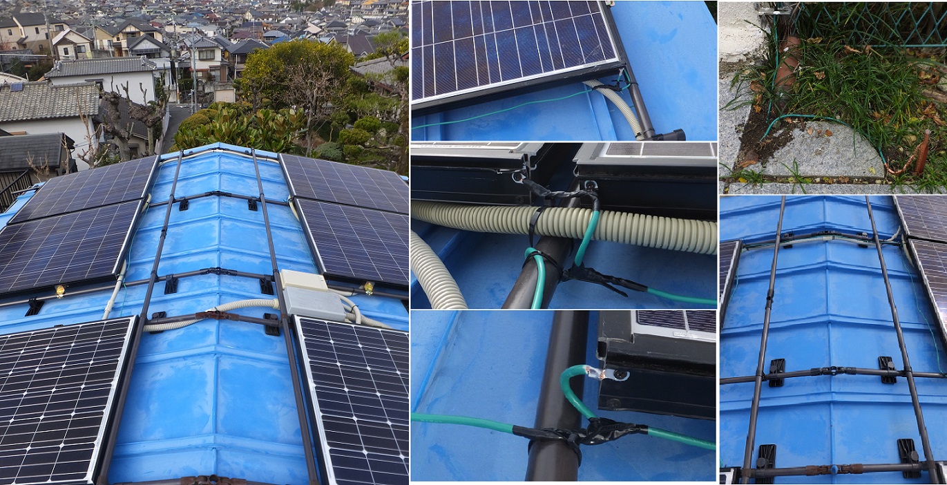 太陽光パネル7枚を入手したところから始まり、配線工事で、しろありによる梁の虫食いが発見され、急遽、しろあり工事に変更。約一週間かかりほど完成。やっと、本来の太陽光の工事に戻った。