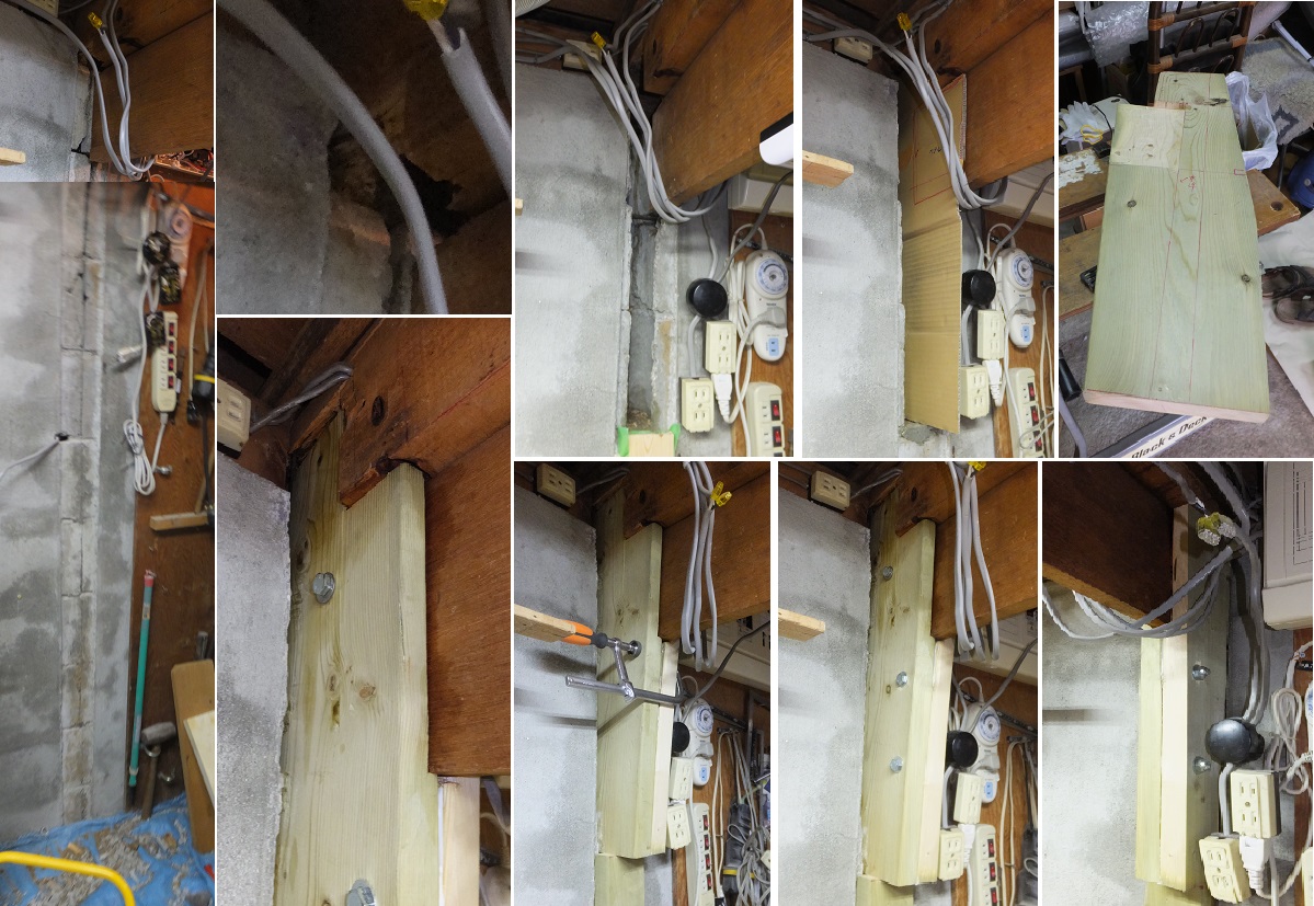 新しい太陽光発電の改造で、屋内配線の延長工事をしていたところ、ガレージの真ん中の2階を支える梁に隙間を発見。 どうも下がっている様子。探ってみると垂木の端が、しろありにやられている。ぼろぼろの木材をはがしていくと、ちょうど虫歯のぽっかりと穴が開いた状態である。
